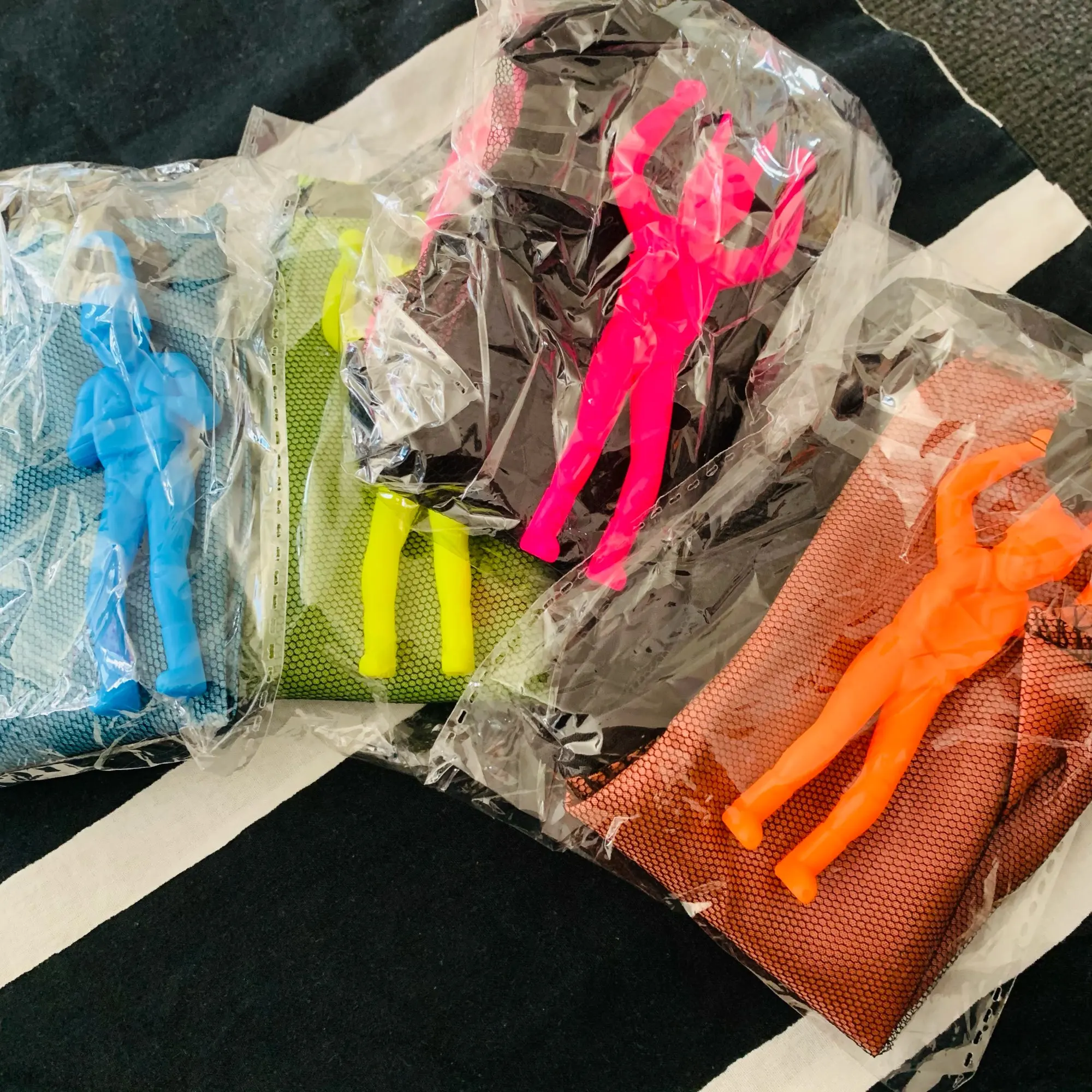 10 PCs skydiver parachute figures which are are available in 5 different colors, including blue, yellow, orange, pink, green, 2pcs for each color. Parachute: Diameter approx 43 cm/17 inch, Plastic man: 9.3*3.3cm/3.7*1.3inch. Sufficient for many kids to play.